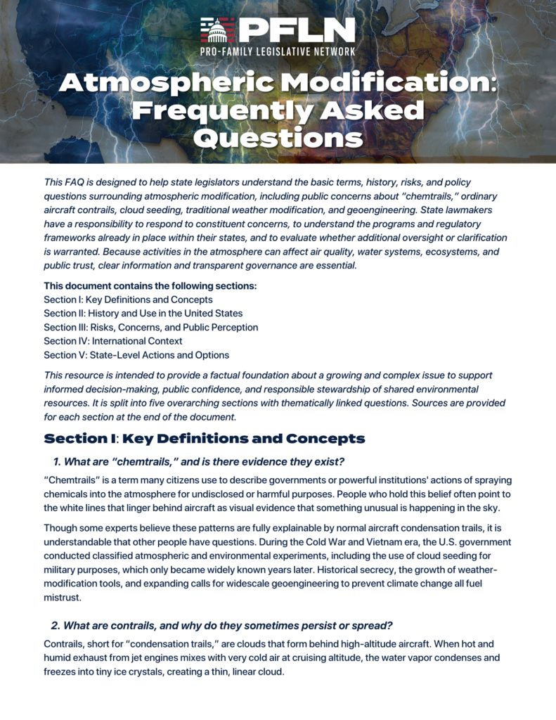 This FAQ is designed to help state legislators understand the basic terms, history, risks, and policy questions surrounding atmospheric modification, including public concerns about “chemtrails,” ordinary aircraft contrails, cloud seeding, traditional weather modification, and geoengineering. State lawmakers have a responsibility to respond to constituent concerns, to understand the programs and regulatory frameworks already in place within their states, and to evaluate whether additional oversight or clarification is warranted. Because activities in the atmosphere can affect air quality, water systems, ecosystems, and public trust, clear information and transparent governance are essential.